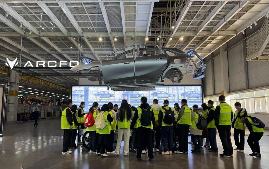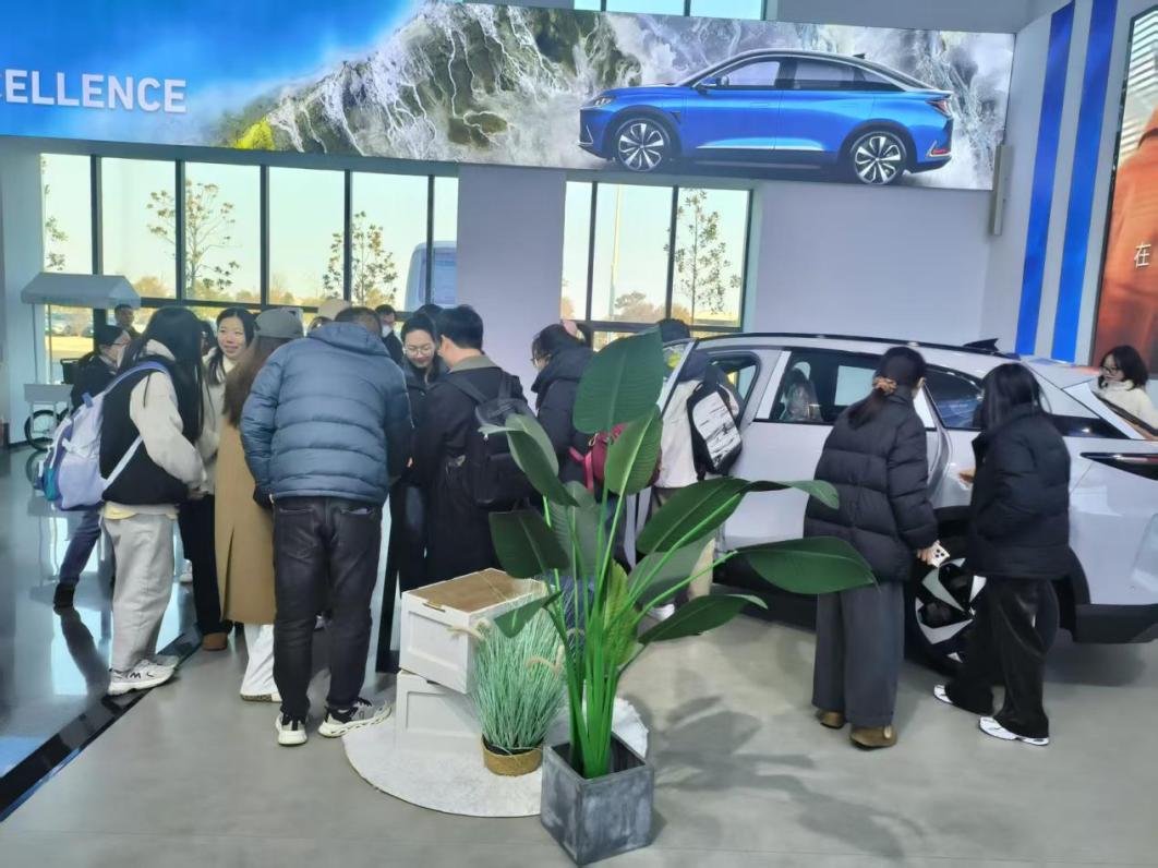 师生们首先进入企业展厅,参观了北汽蓝谷麦格纳旗下高端品牌——ARCFOX。展厅内集中展示多款智能电动车型,借助交互式屏幕与实车展示,大家直观感受到ARCFOX在设计美学、智能座舱、三电技术等领域的创新成果,同时了解了企业通过数字化用户运营平台,实现从产品定义到售后服务全链路数据贯通的管理逻辑,这一实践生动体现了企业在性价比与技术突破上的双重优势,为MBA学员提供了鲜活的商业案例。